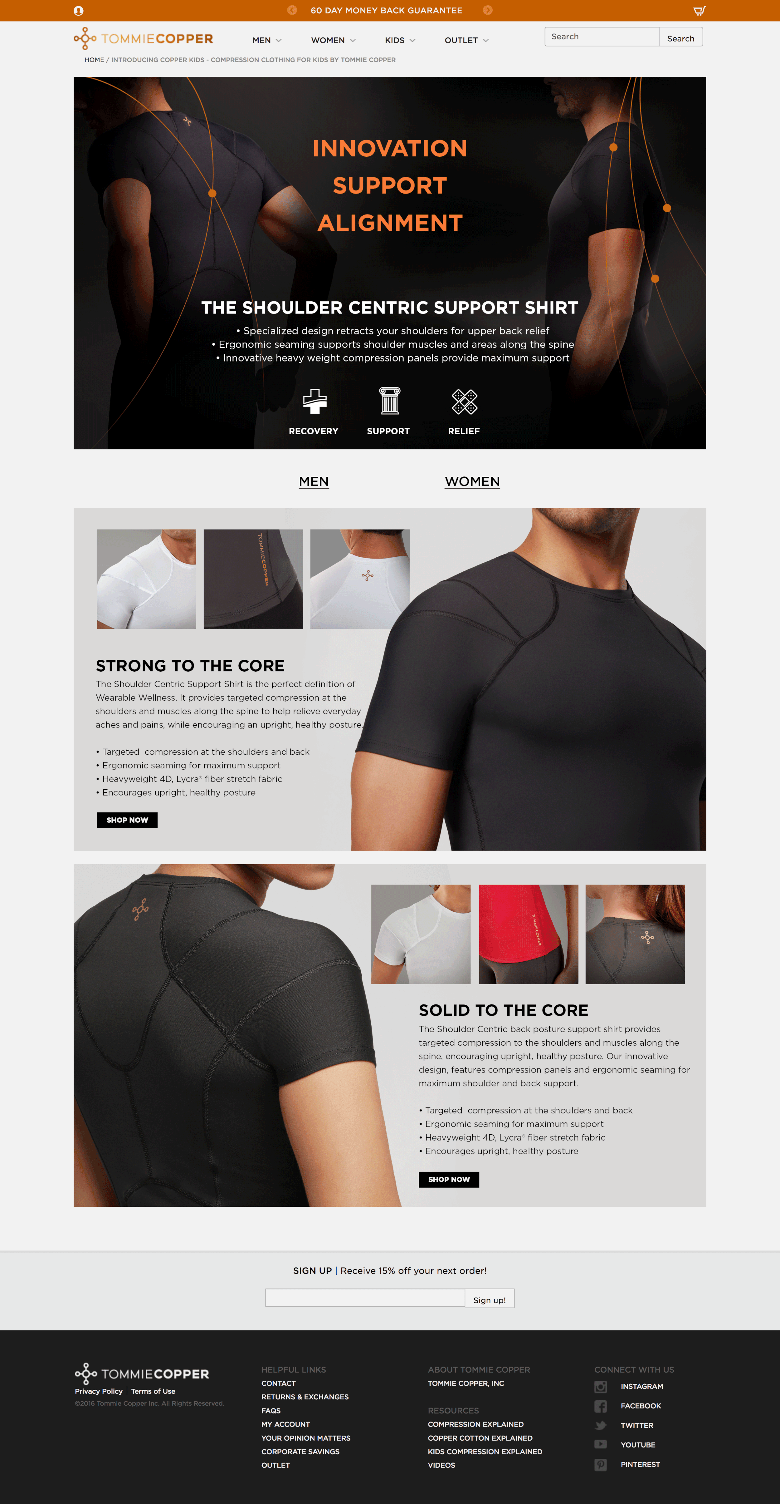 Small structural adjustments were made on the homepage while big changes were made visually to create contrast. Modules would stand out amongst each other rather than lost in previous designs. Larger and bolder imagery brought the consumer closer to the apparel. Smart coding made updates easy, especially for promotional heavy copy.